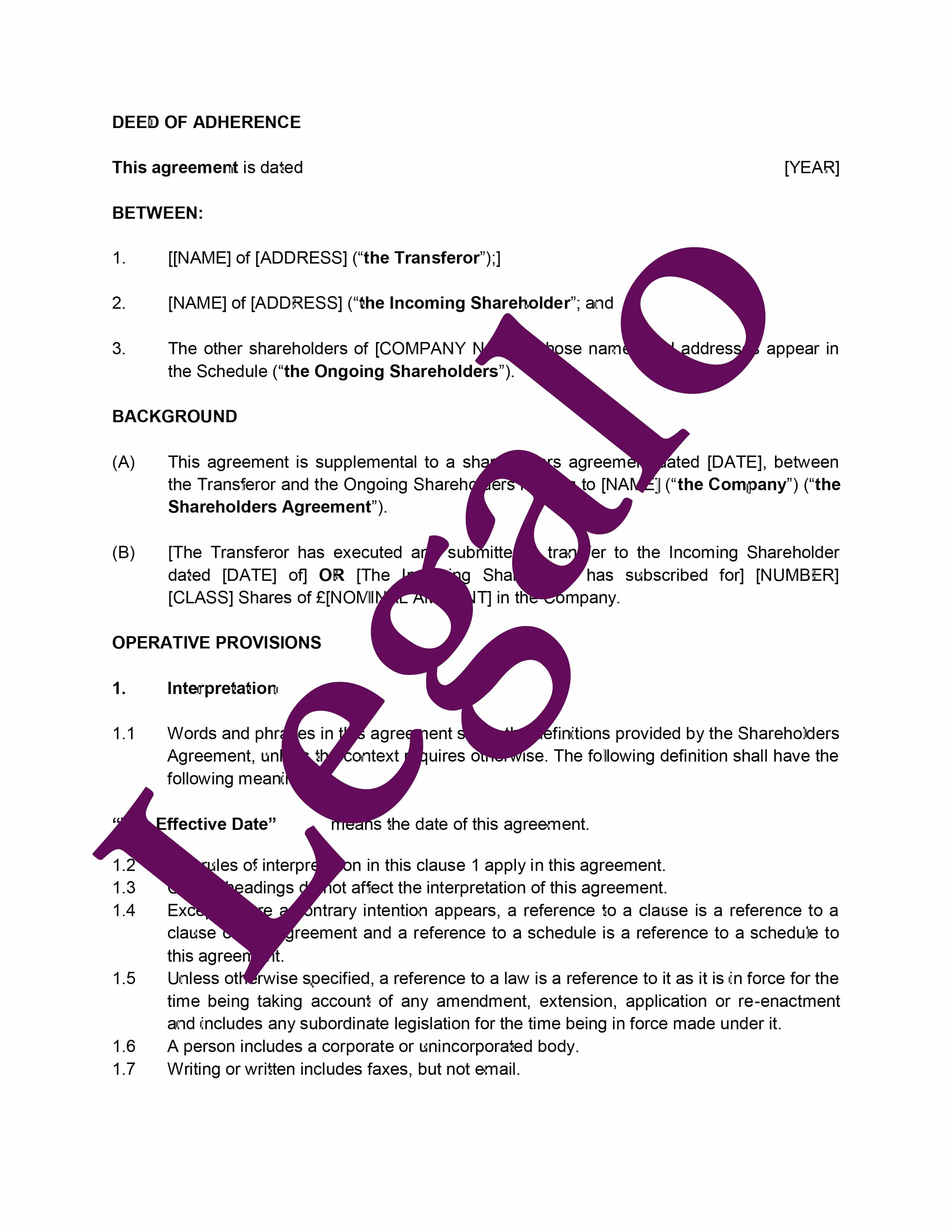 A Deed of Adherence to a shareholders agreement is a legal document that you use when a new shareholder joins an existing shareholders’ agreement or alternatively an investment agreement.