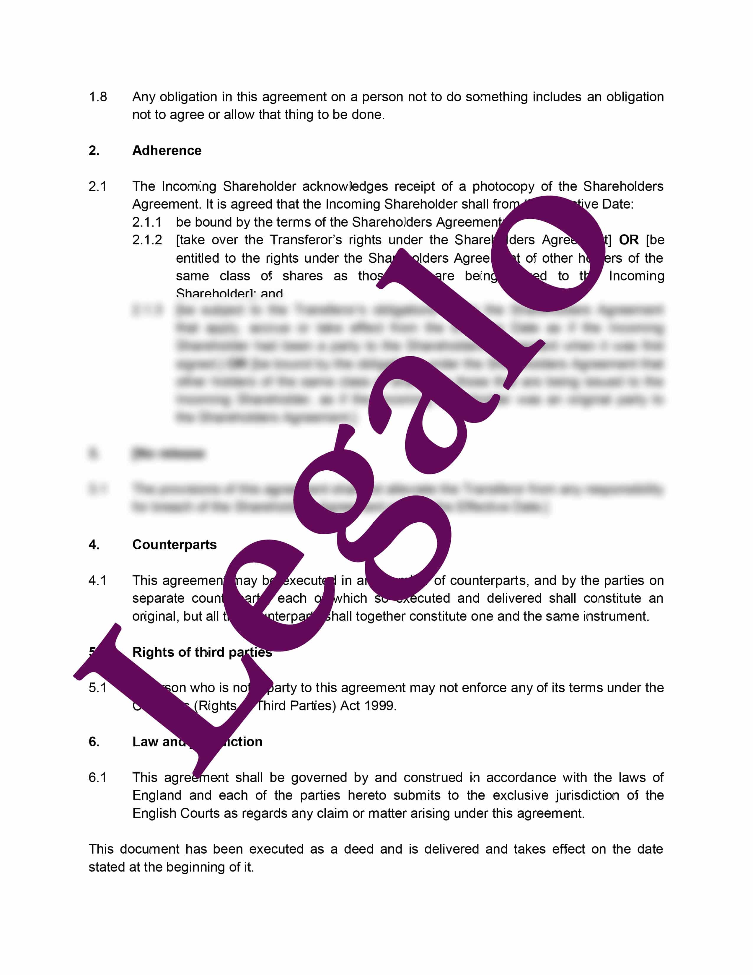 The Deed of Adherence will reference the existing shareholders agreement and it ensures the new shareholders are subject to the terms of that agreement. This then ensures that you maintain the balance of rights and responsibilities among all parties.