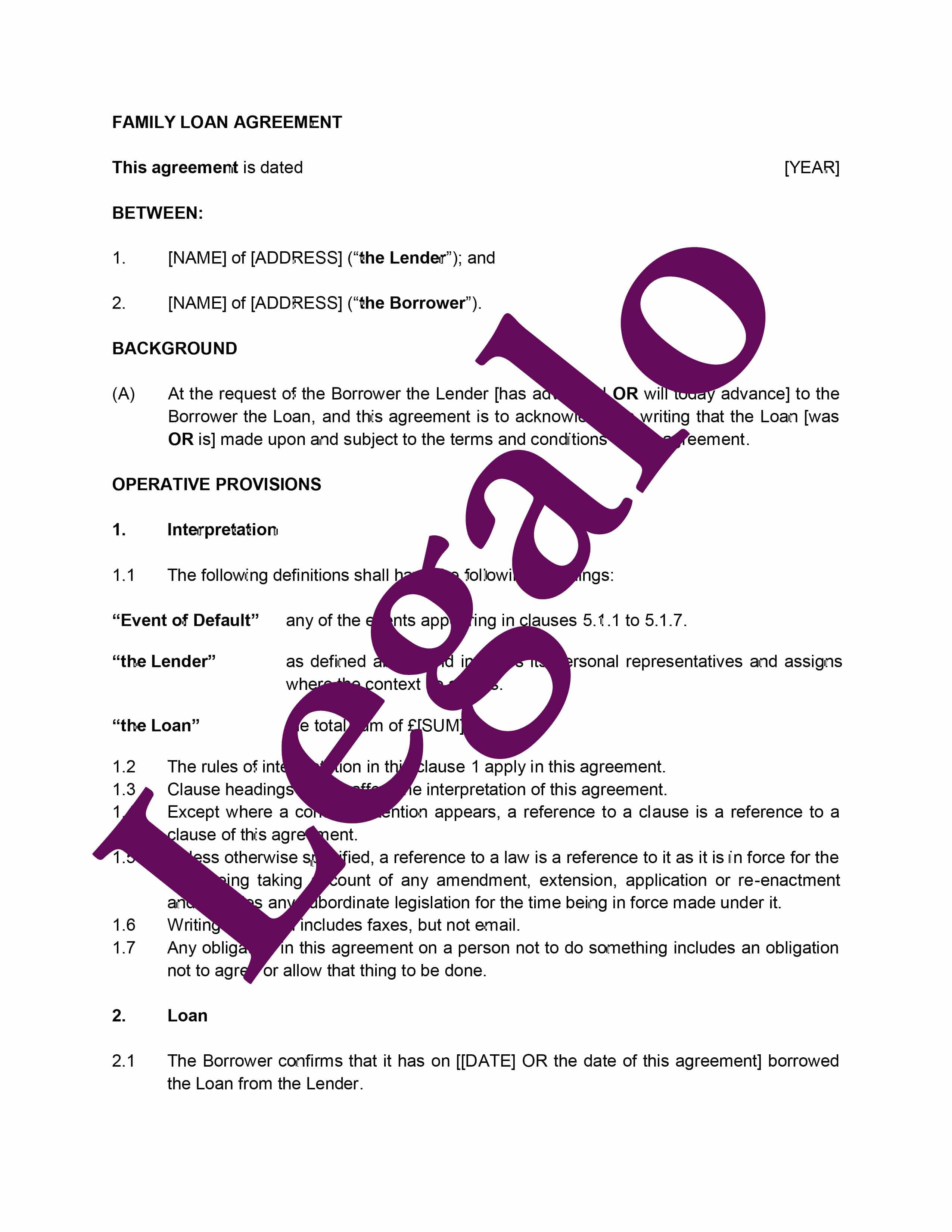 When you buy the template, it comes with a helpful guide to completing it – a walk-through of all its clauses. This makes it very easy for you to complete. For a preview of a very similar guide, please have a look at our guide to our standard loan agreement. Please note the family loan agreement template does not include the clause 6 covenants which that guide mentions. Neither does it include references to making the loan to a company.