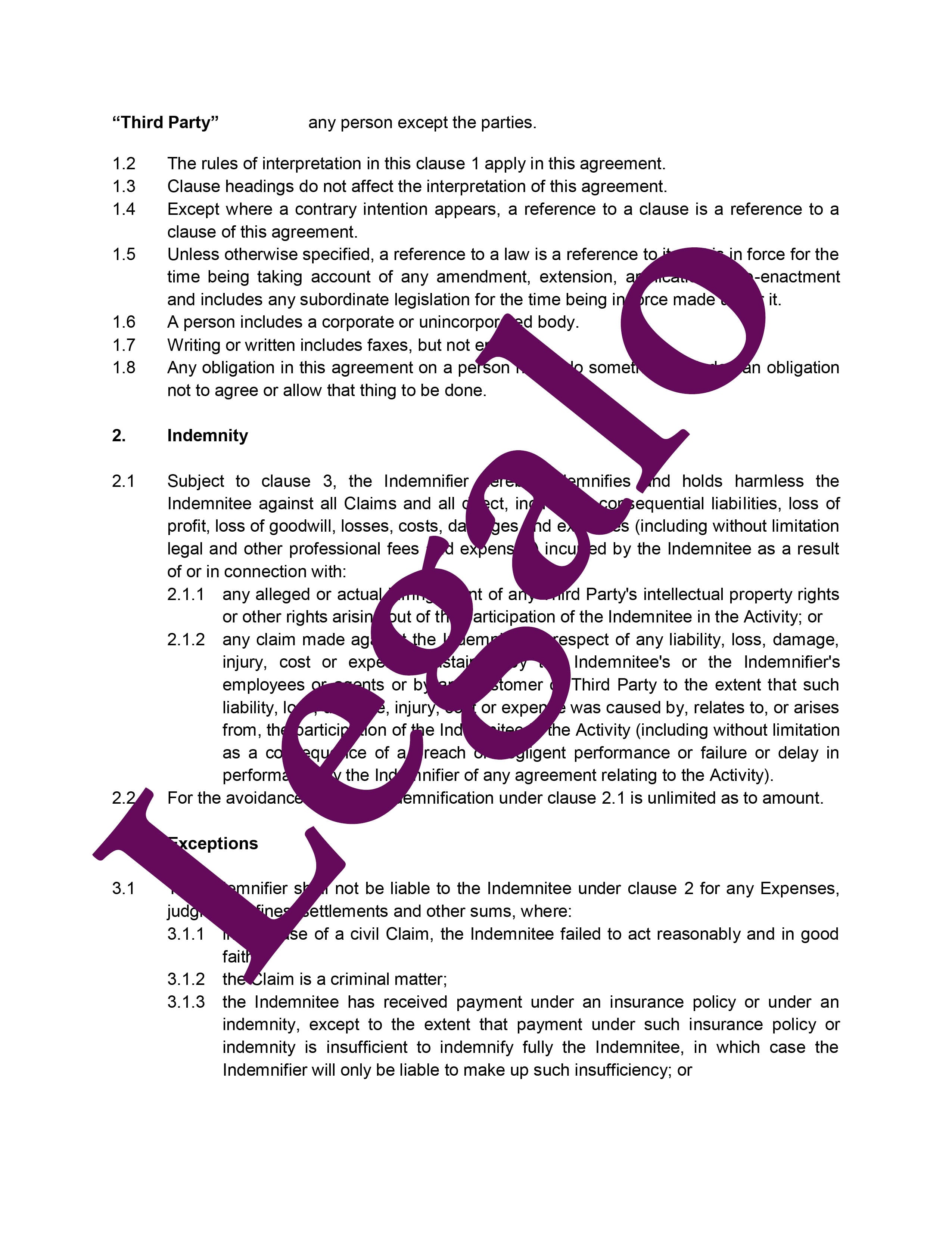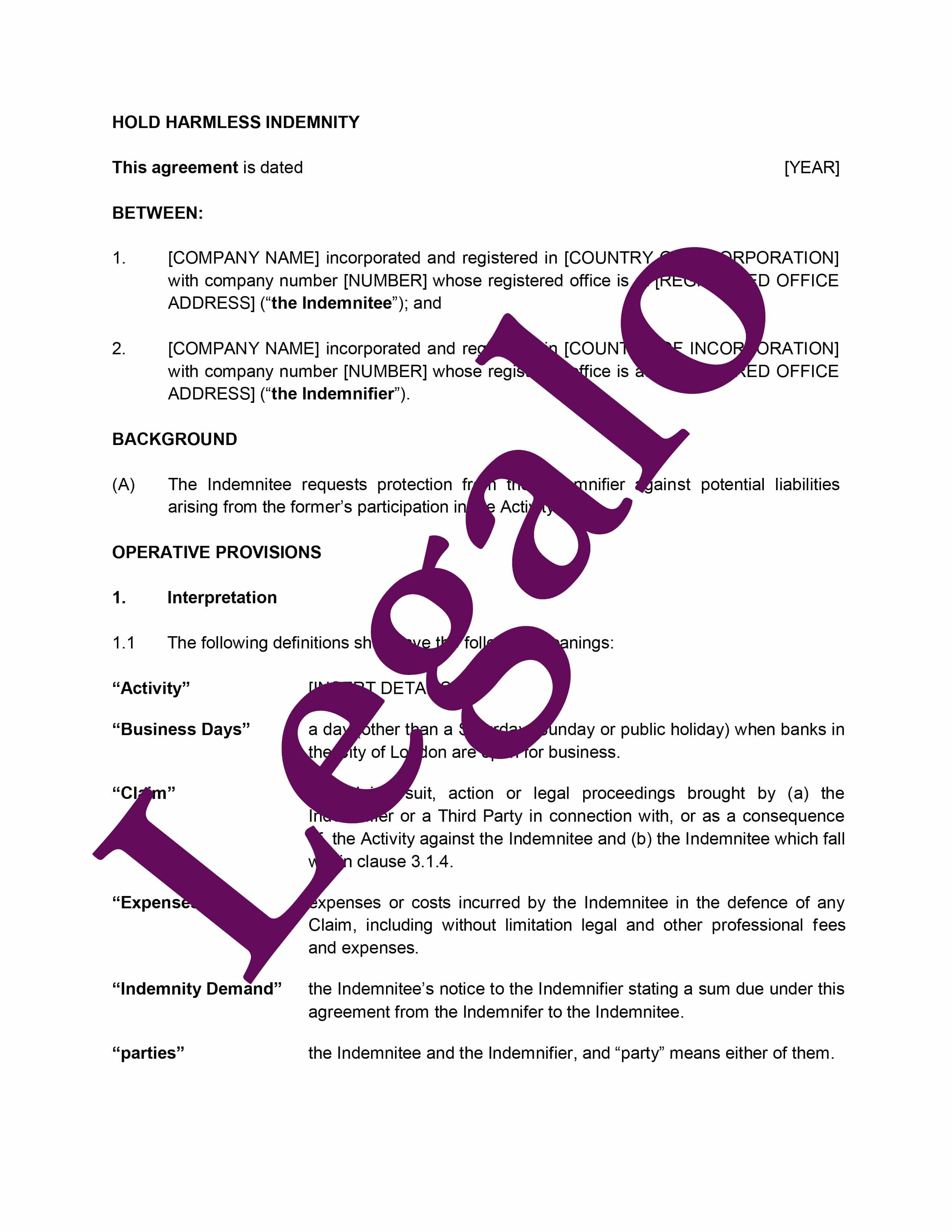 Our Hold Harmless Indemnity template: