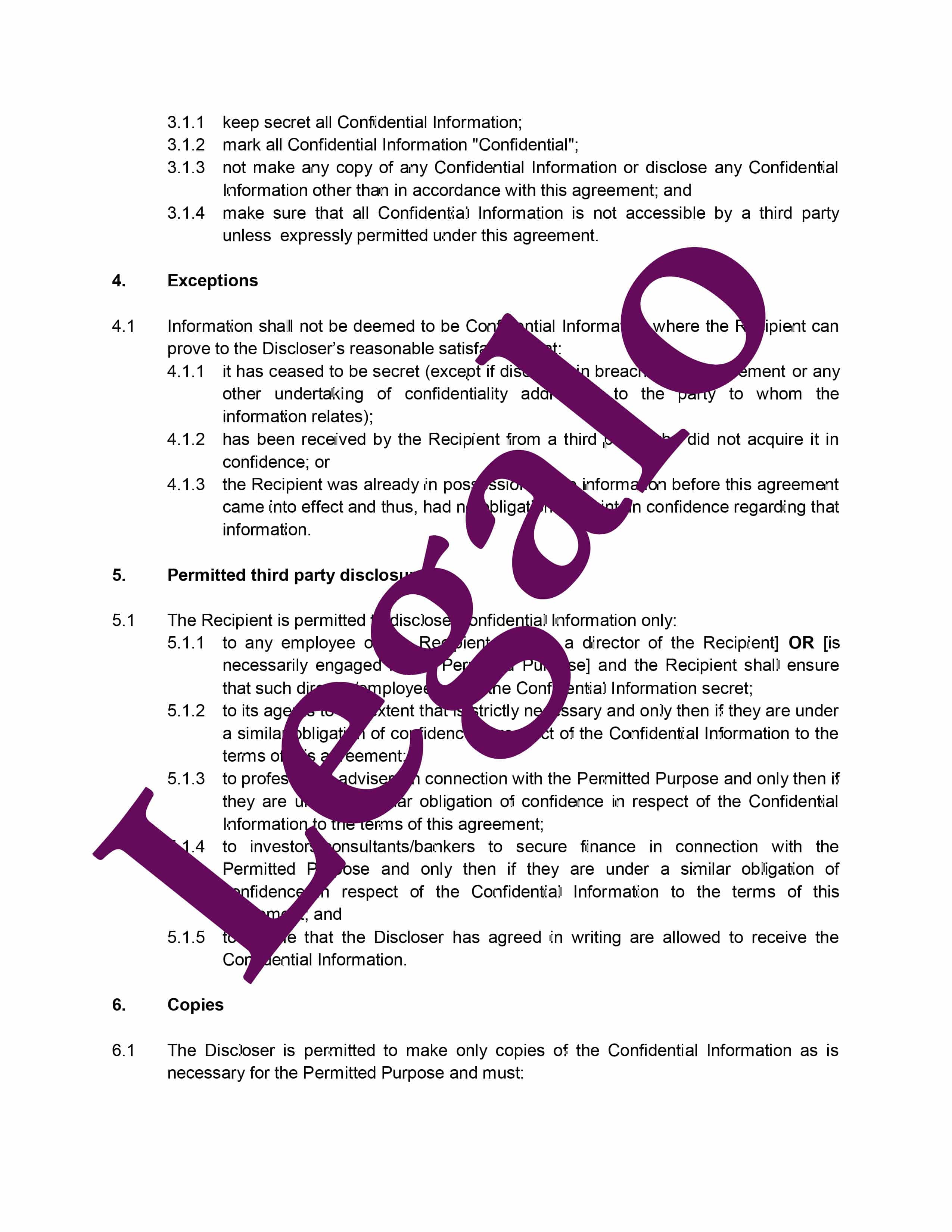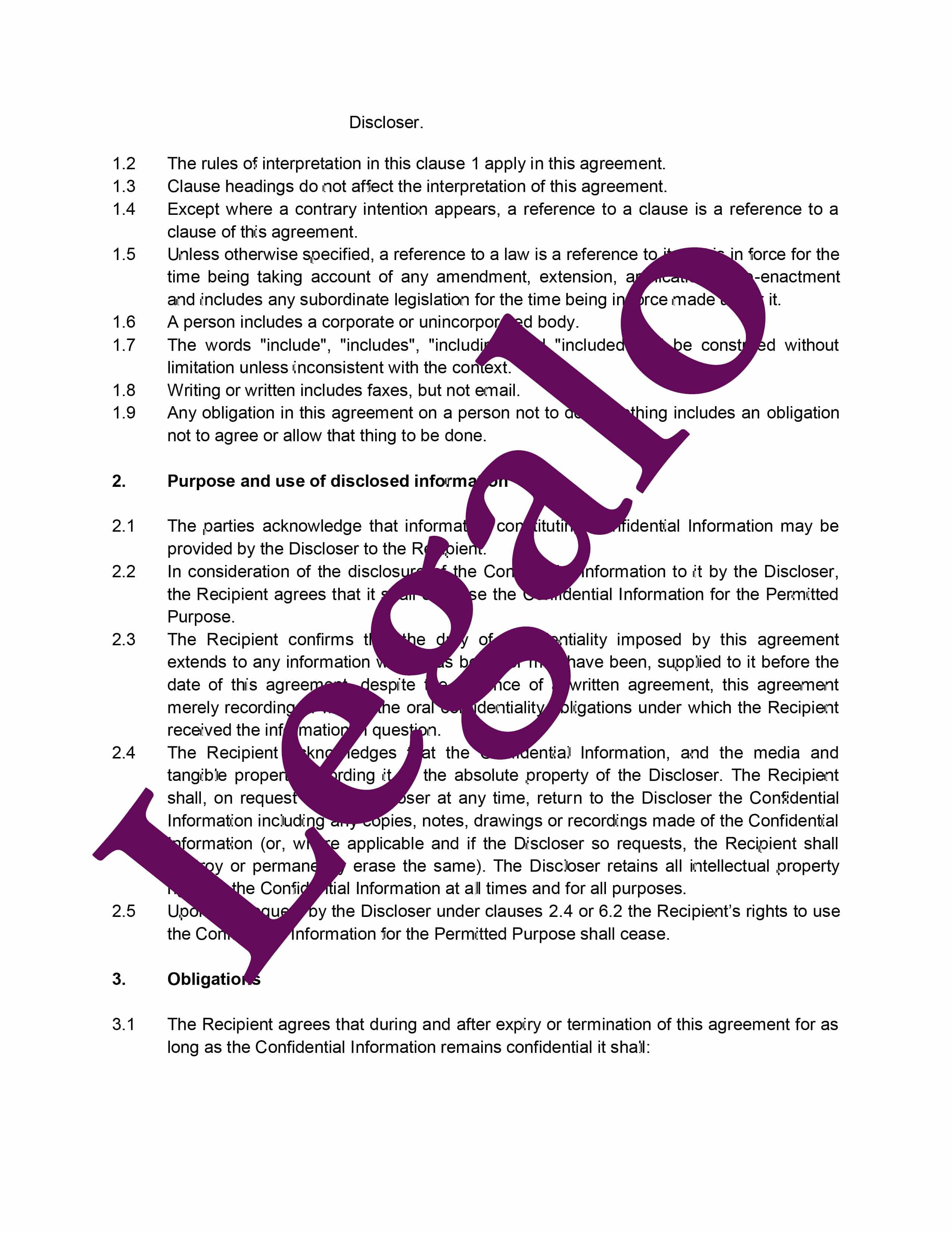 If you would like to know more about the contents of this template before you purchase it, then have a look at our very similar Simple Non Disclosure Agreement and scroll down to the heading “Clauses in this Simple NDA”.