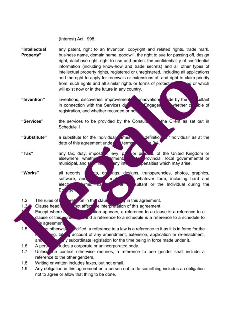 This consultancy agreement should reflect the true working relationship between parties and is designed to be used where the contractor is a self-employed contractor and the individual is not an employee of the client. This agreement is not suitable for employees taking temping contracts or other arrangements where the consultant is not an employee of the end client. Legalo cannot guarantee that the arrangement is accepted as genuine by HM Revenue & Customs. Much depends on how the parties operate the contract in reality. This template contract is designed to support the genuine situation, but it is down to the consultant and individual to ensure that they operate under it in a manner consistent with this tax status at all times and, if questioned by HMRC on the situation, that the answers given are also genuine and consistent.