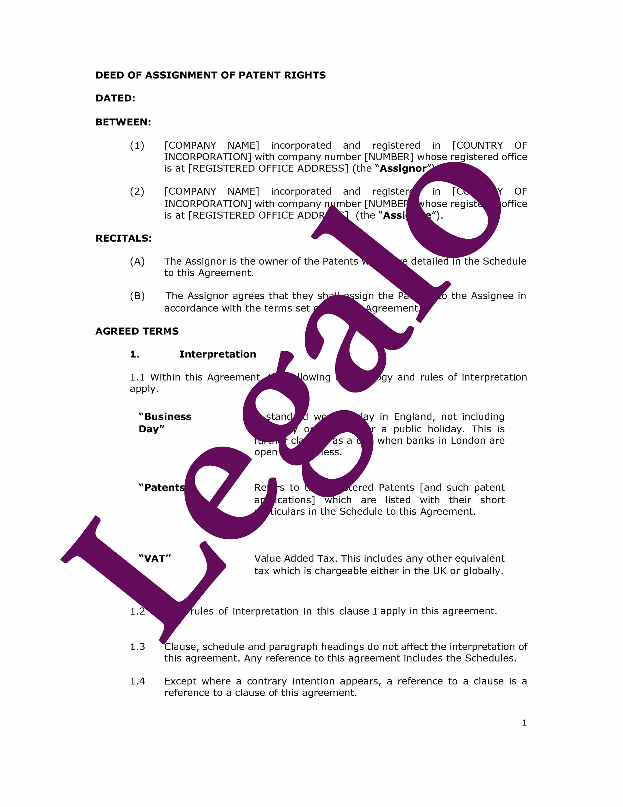 Use our patent assignment template when you are transferring a patent between the registered owner of the patent and another party. The assignment document acts as the sale agreement for the patent. However, you can also use the template when the party receiving the patent (the ‘Assignee’) is not paying anything for the patent.