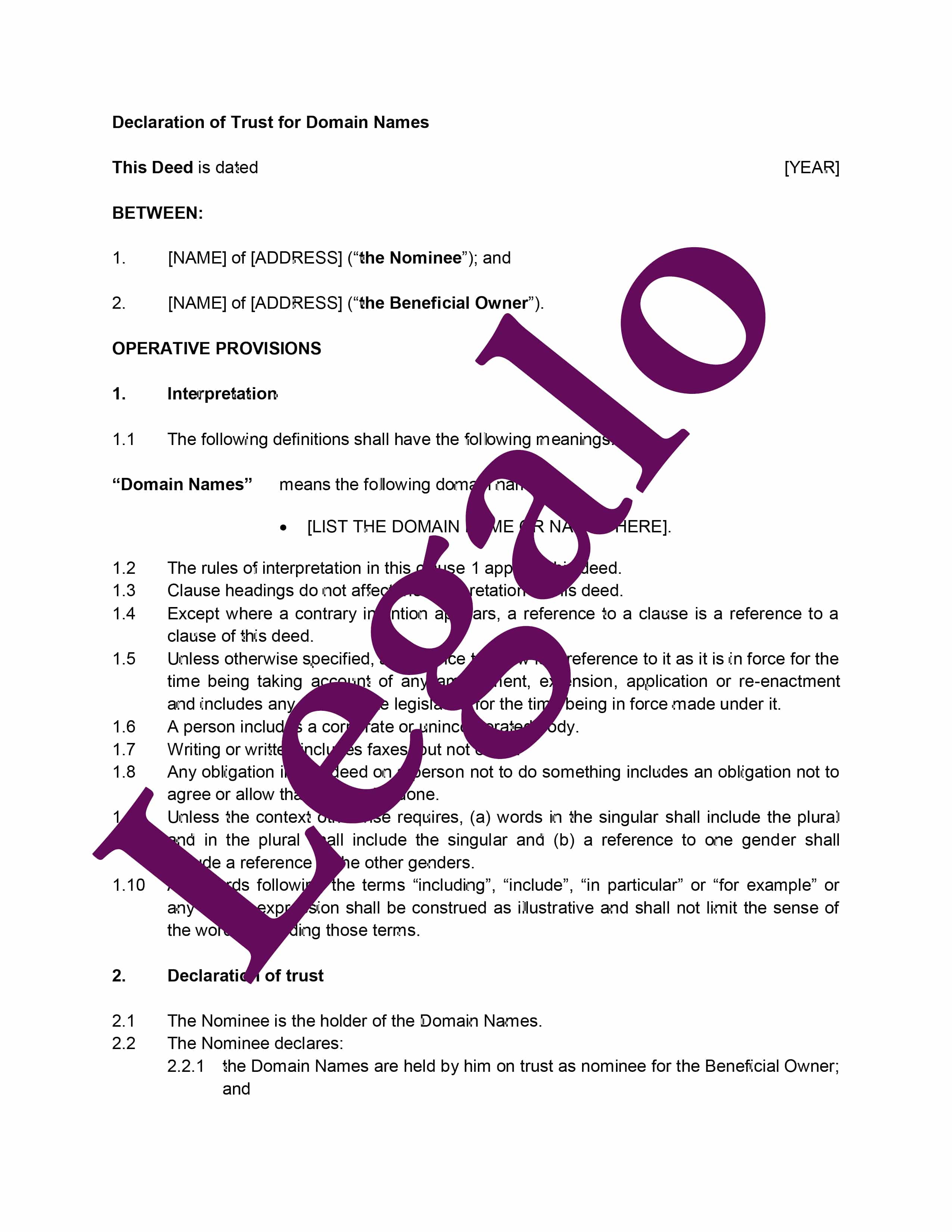 Our Declaration of Trust for Domain Names template is for use where a nominee holds a single domain name or multiple domain names in trust for someone else. Either could be an individual or a company. The Declaration of Trust template is brief, without unnecessary waffle, thus making it quick and simple for you to use.