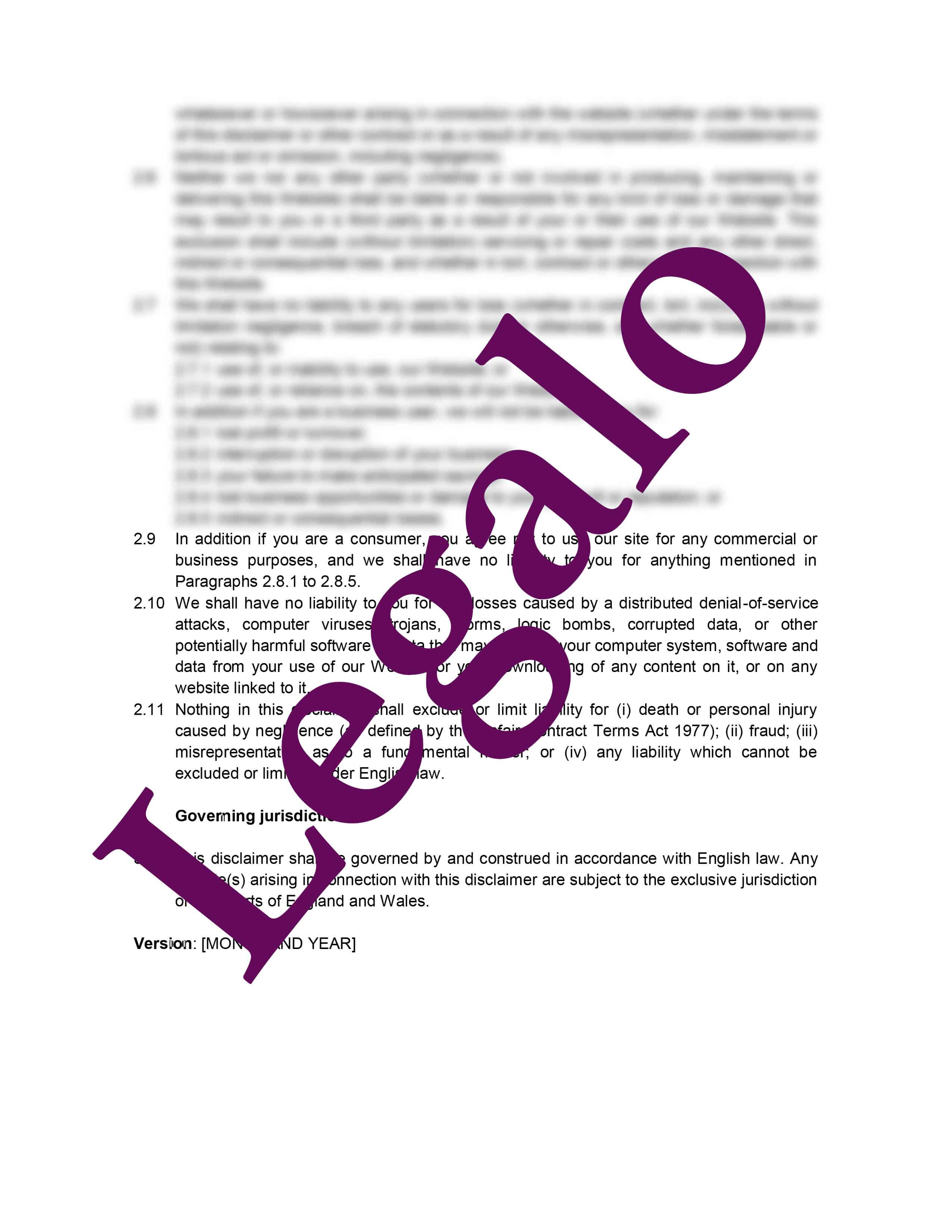 When you use the Website Disclaimer you will be protecting yourself and your website against any legal liability to visitors of your site. If you are compliant with the e-commerce laws of the UK you can also help your rankings with the search engines. We have had the template drafted by a solicitor so that it conforms to the laws, yet it is easy to read and understand. You will be able to customise the template to meet you specific needs. Once you have customised it, you can store it as well as manage it online.