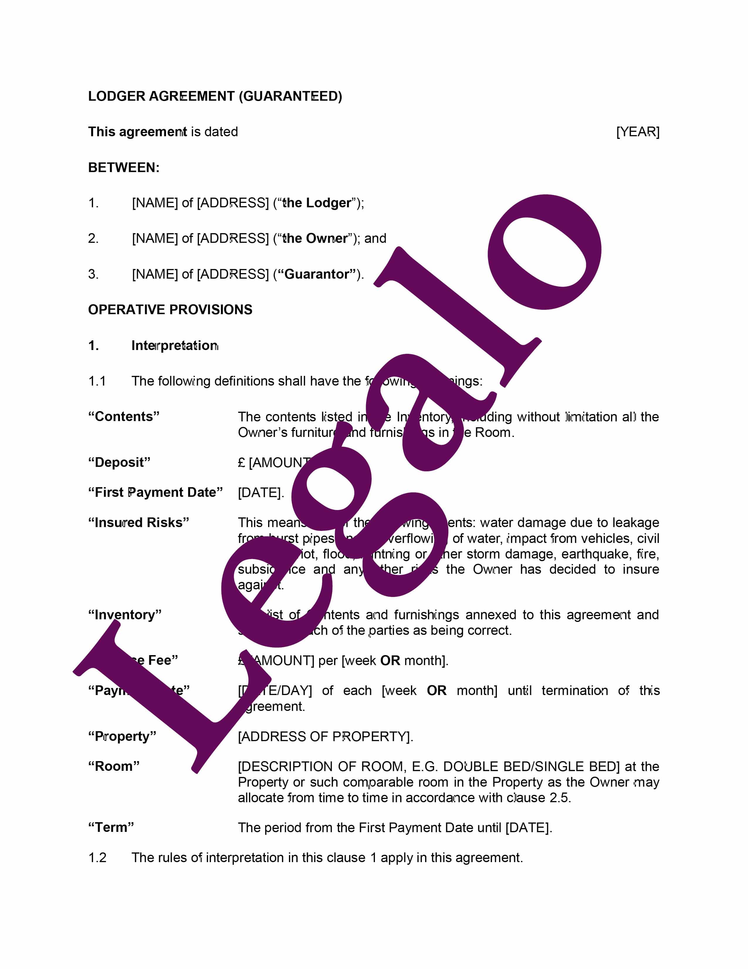 Our Guaranteed Lodger Agreement template is for use by a residential property owner when taking in a lodger to live in their home and whose obligations will be guaranteed by someone. Such obligations include: