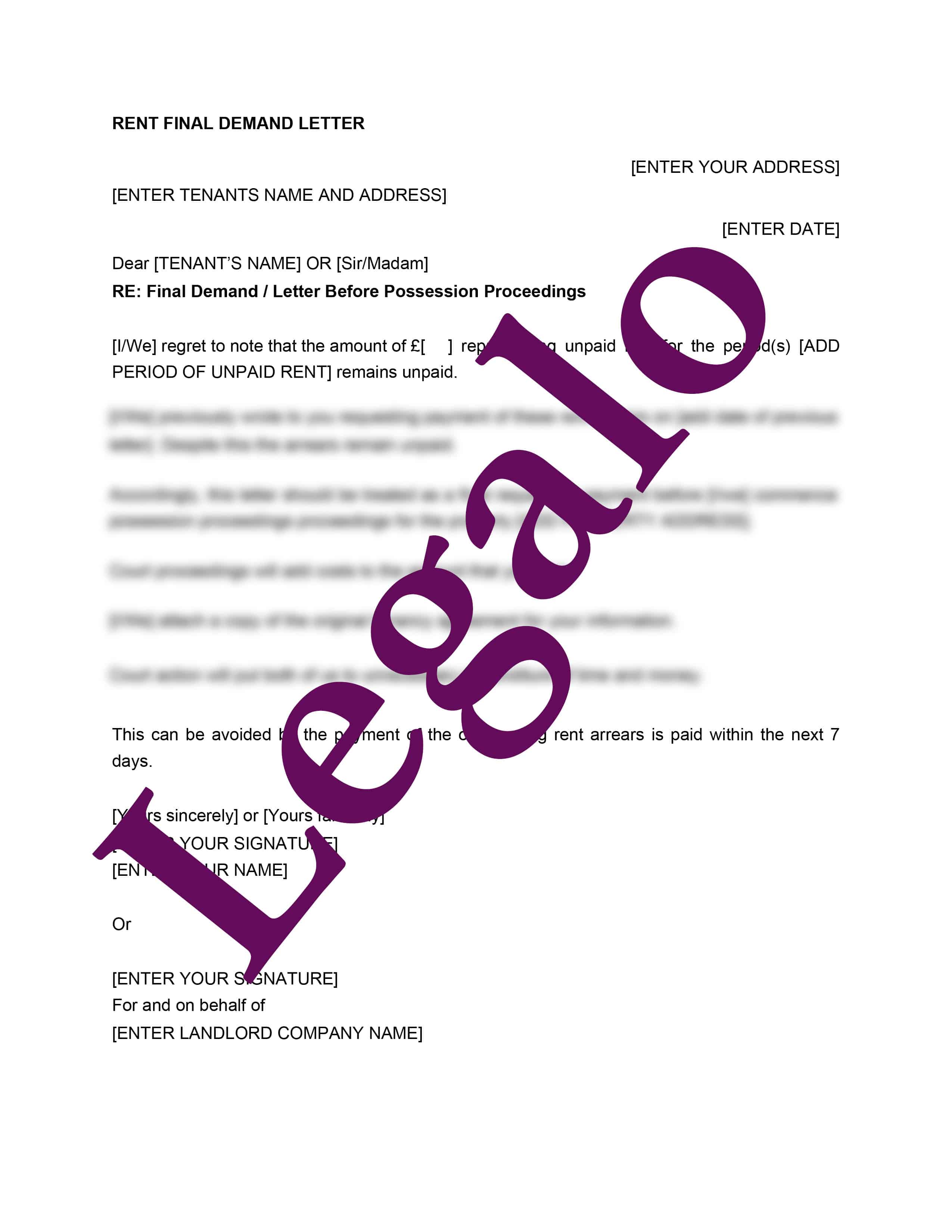Use the Rent Final Demand Letter to send to your tenant if they have not paid rent.